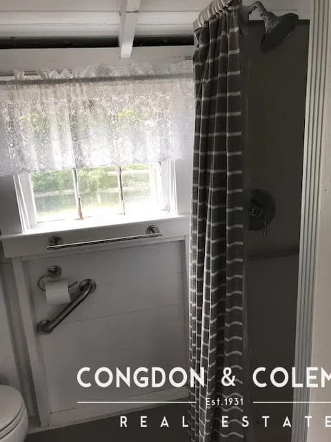 Rustic historic depression cottage built in 1927 with small deck outdoor shower & rustic deck furniture. Open concept with kitchen and living area.