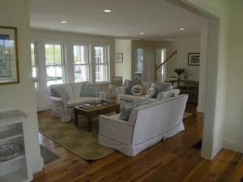 Bright and cheery Sconset house. Open living room, dining room and kitchen area. powder room. Bedroom with two twin beds and full bath. Second floor: bedroom with king size bed and full bath, two bedrooms each with twin beds and one shared bath off hall. Private outside garShow More